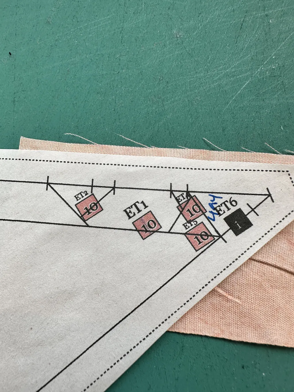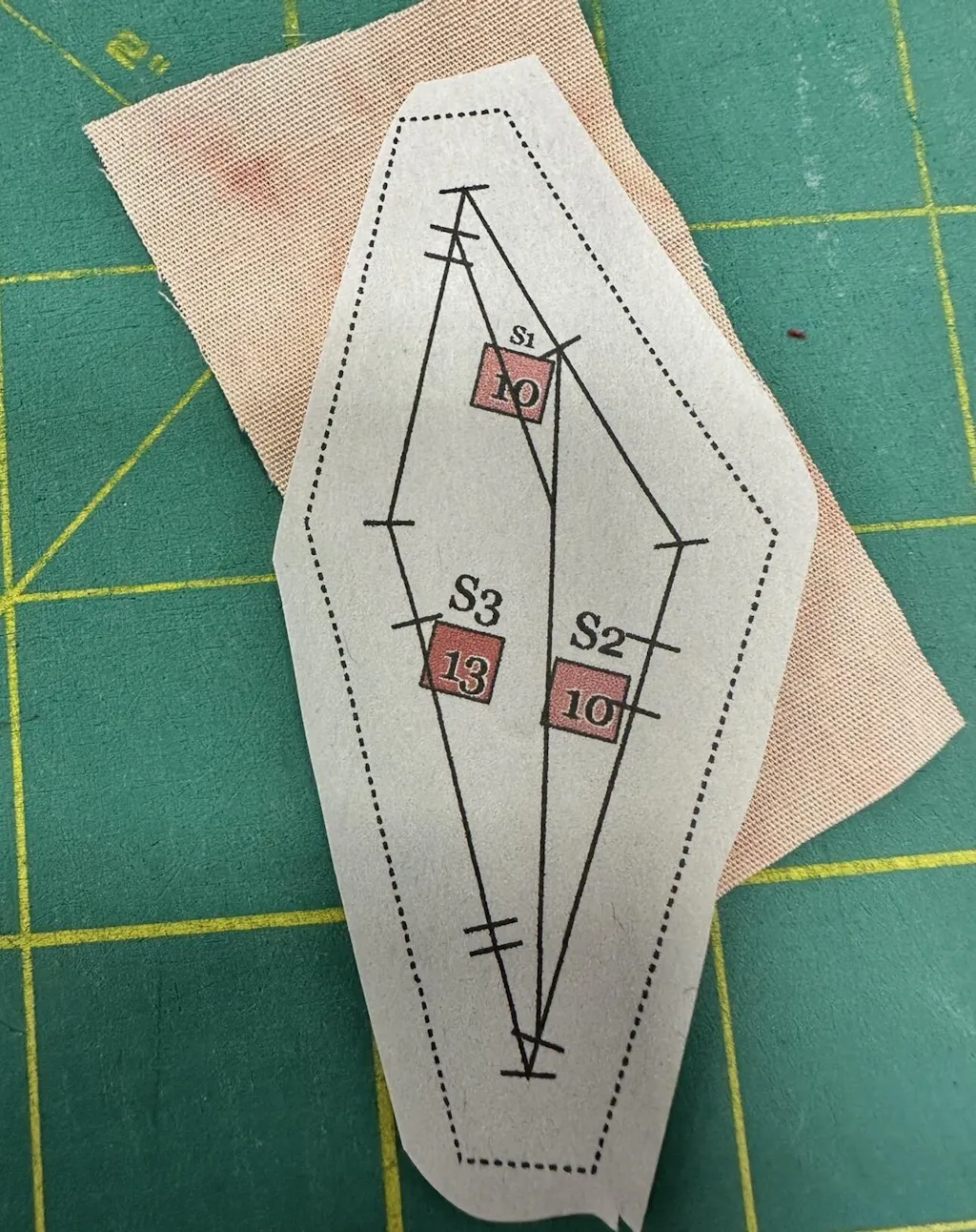This paper piecing pattern includes closeups, cutting and mounting steps, a tutorial, and two versions of the pattern: one with color references, one blank to let you see the sewing lines better.